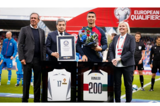 Cristiano Ronaldo receives Guinness World Records certificate after becoming first male player to reach 200 international appearances (Photos)