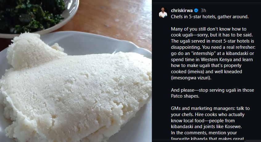 He also criticised how ugali is sometimes shaped in high-end restaurants. He said certain presentations do not reflect how the food should naturally look. He added that authenticity should be respected in serving local dishes.