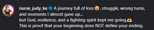 “A journey full of loss, struggle, wrong turns, and moments I almost gave up,” Nurse Judy said.