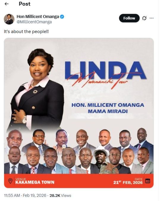 “It’s about the people,” the former senator declared, sharing a poster showing her among other leaders who are expected to camp in Kakamega on Saturday, February 21, 2026.