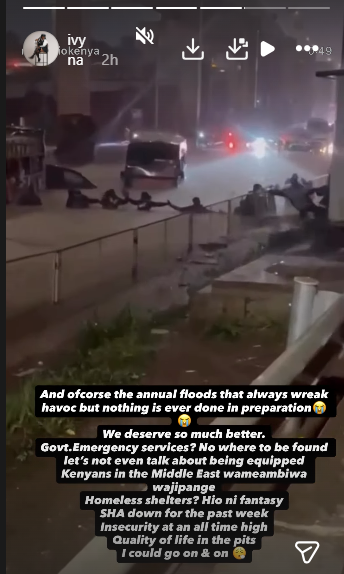 Ivy Namu, the wife of media personality Willis Raburu, has criticised the government for poor preparedness amid heavy rains that have caused flooding in several parts of the country.