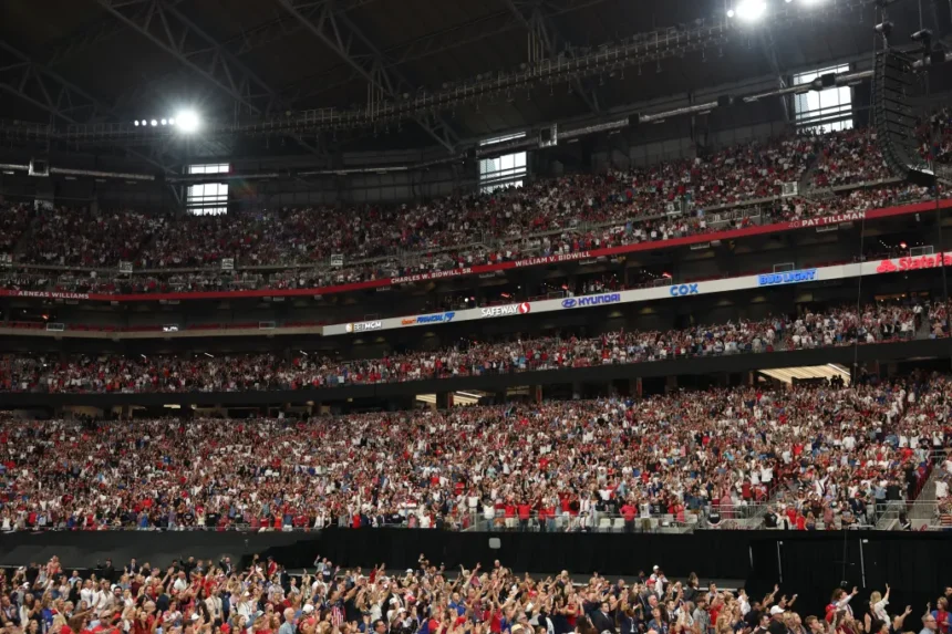 State Farm Stadium, which seats about 73,000, filled to capacity within hours of doors opening at 8 a.m. Thousands more were directed to the Desert Diamond Arena next door, reserved as an overflow venue.