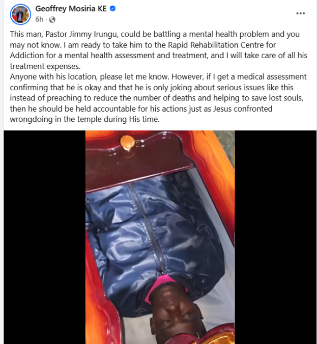Geoffrey Mosiria has publicly expressed concern over the actions of Pastor Jimmy Irungu following a controversial incident in which the preacher was seen inside a coffin.