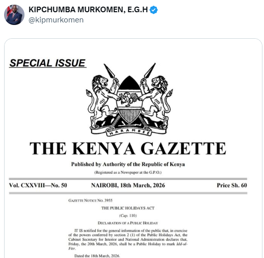 Interior and National Administration Cabinet Secretary (CS) Kipchumba Murkomen has officially declared Friday, March 20, 2026, a public holiday to mark Eid al-Fitr.