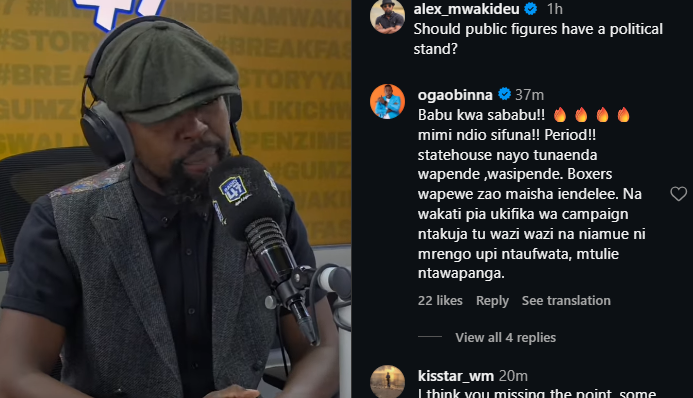 “Mimi nauliza, and it is an honest question, public figures, like Oga Obinna, kuna ubaya gani kwa public figures kuwa na msimamo wa kisiasa?” Alex Mwakideu said.