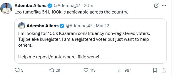 “Kenya needs a Renaissance aki! Tuko Kadi Je Wewe? Register Na Mbogi! Good Work @Ademba_47 #TukoKadi #RegisterNaMbogi,” Abbie Zuena stated, appreciating the initiative.