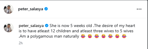 In an Instagram post on Sunday, April 12, 2026, celebrating the birth of his daughter, Salasya said he envisions having at least 12 children and marrying between three and five wives.