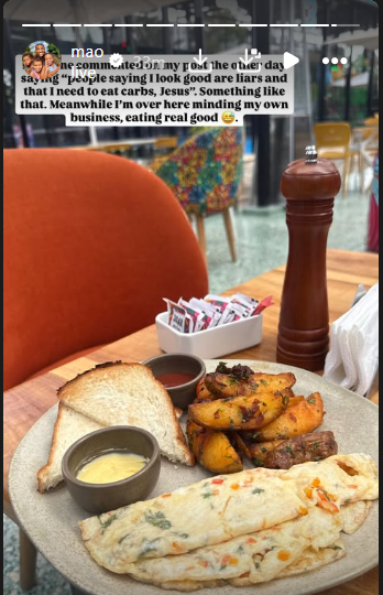 Karanja shared that the comment she saw suggested that people who praised her appearance were not honest and that she needed to eat more carbohydrates. She said the message was written in a disrespectful tone and targeted her body.