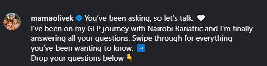 She added that she has been using GLP, a glucagon-like peptide-1 treatment, as part of her weight management journey. Karanja explained that some people have labelled it as an easy way out, but she strongly disagrees with that opinion. She said her experience includes discipline, health focus, and long-term lifestyle changes. Her message emphasised that the process is not simple or quick.