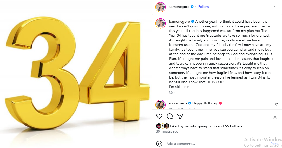 Media personality Kamene Goro has marked her 34th birthday with a personal and reflective message, opening up about a year that reshaped her outlook on life, relationships, and faith.
